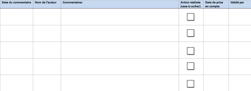 La fiche est une très bonne idée ; il faut en conserver l’aspect simple. L’ajout d’une case à cocher permettant d’indiquer que la remarque a été prise en compte est pertinent. La fiche pourrait ainsi comporter : nom, date, remarque, case à cocher (résolu ou non), ainsi que le nom de la personne ayant traité la remarque. Cette fiche serait à placer en première page du dossier bleu.