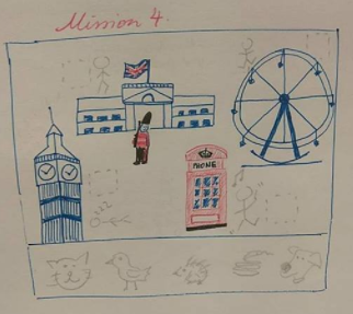 |dev_expl=Il s'agit ici de la deuxième phase de la contextualisation qui s'enchaîne directement après l'activité précédente. Cette fois-ci, le joueur a devant lui sa carte de Londres avec les éléments culturels (comme dans P{{Expansion depth limit exceeded|éléments culturels}}) et les méchants qu'il a placés dans l'activité précédente. Il y aura les animaux kidnappés qui devront être glissés au méchant correspondant. Le joueur entendra par exemple "The cat is with the bad guy who is dancing".