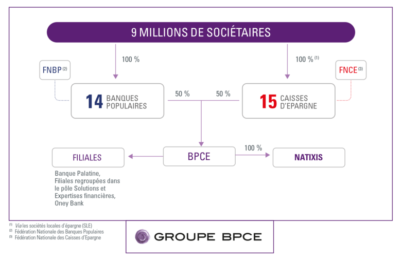 Au niveau du Groupe : Les Banques Populaires (BP) et les Caisses d'Épargne (CE) sont des banques coopératives ; elles sont détenues par leurs clients sociétaires. Ces sociétaires élisent un Conseil d'Administration (CA) qui est chargé de définir et de faire appliquer la stratégie. Les BP et les CE détiennent ensemble l'organe central, le groupe BPCE, qui mutualise de nombreux métiers (informatique, assurance, etc.). Le patron de BPCE est nommé par les Banques et les Caisses régionales.